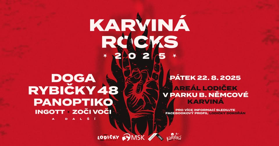 Další ročník KARVINA ROCKS je tady! Jedna z naších nejoblíbenějších akcí je tady! Konec prázdnin bude ve znamení rockové hudby na Lodičkách. Začátek: od 16:00 Vystoupí: Mean Daddies, Ingott, Messalina, PanoptikoGate, Crasher, Doga, Zoči Voči, Rybičky 48 Pro více info klikněte zde.