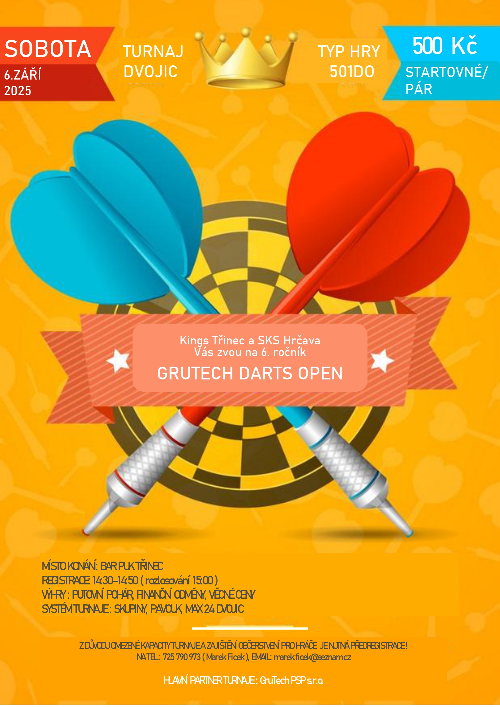 Kings Třinec a SKS Hrčava zvou všechny hráče i fanoušky na šipkařský turnaj dvojic GRUTECH DARTS OPEN. Přijďte si užít sportovní atmosféru, poměřit síly a zahrát si o putovní pohár, finanční i věcné ceny.